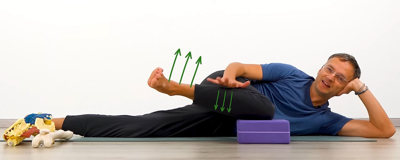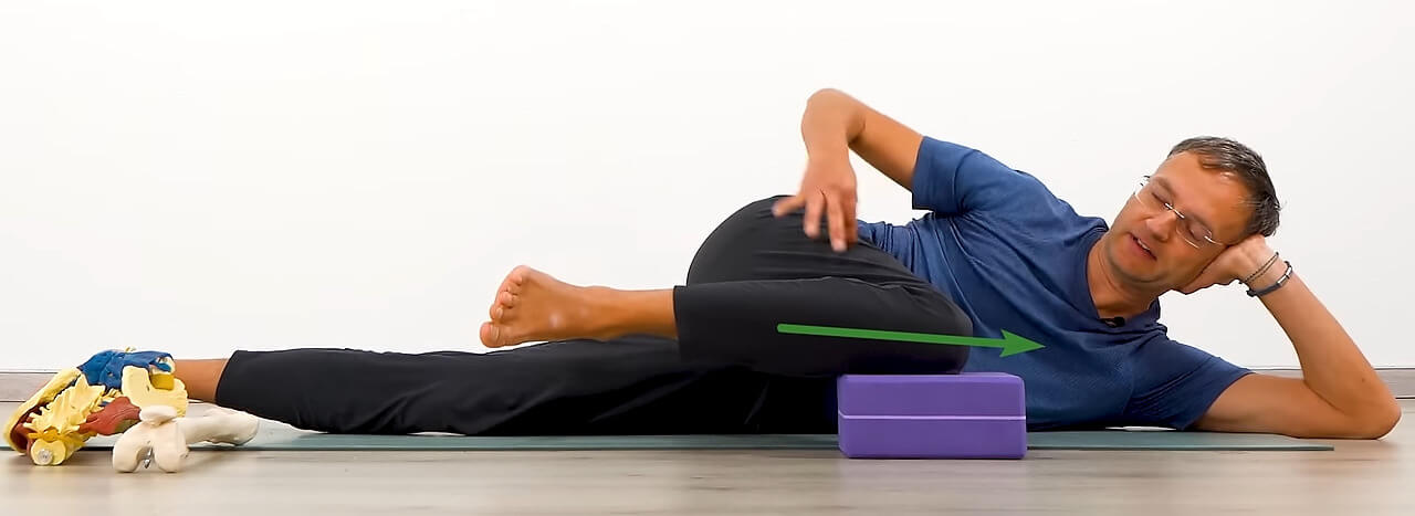 Hebe dein Bein dann ein kleines Stück an. Allein diese kleine Bewegung aktiviert gezielt die Muskeln rund um die äußere Hüfte, vor allem den Tensor fasciae latae.