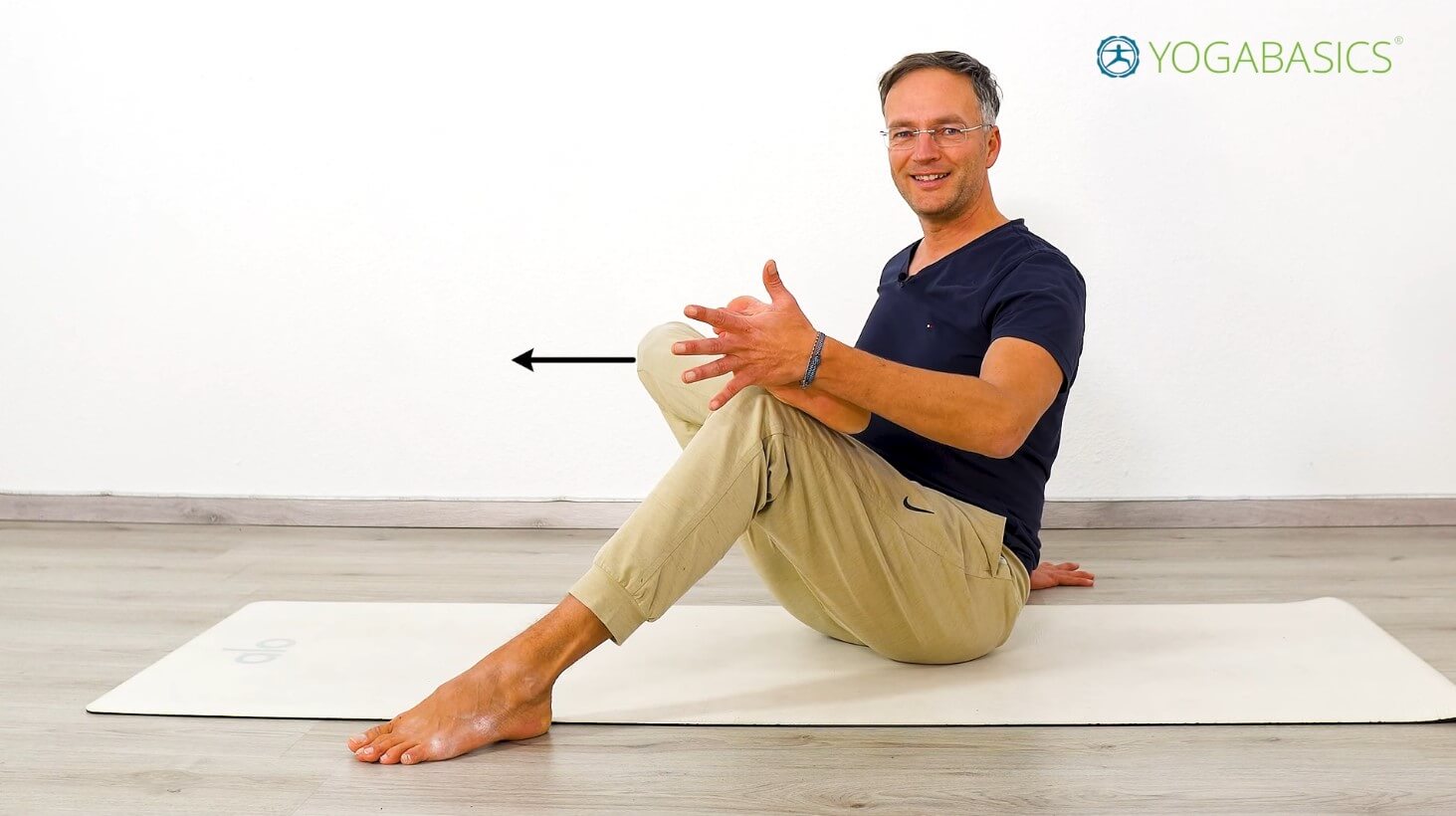 - Knie nach vorne schieben: Schiebe dein rechtes Knie nach vorne, während du das linke Knie zu dir heranziehst.